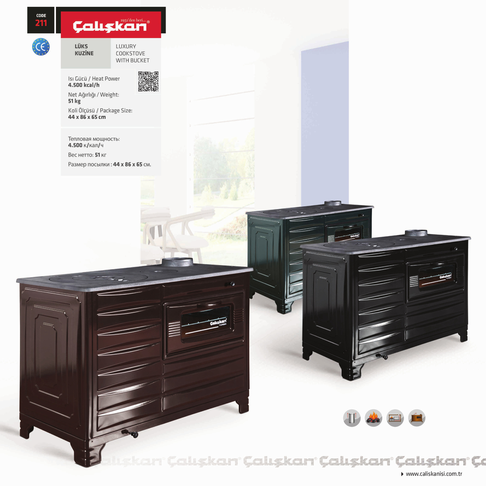 Çalışkan 211 Kahverengi Lüks Kuzine, hem ısınma hem de pişirme ihtiyacını aynı anda karşılayan şık ve fonksiyonel bir modeldir. 4.500 kW ısı gücü ve 45 m² ısıtma kapasitesiyle küçük ve orta ölçekli alanlarda yüksek verimlilik sağlar. Demir döküm üst tabla ve kalın sac yapısı ile uzun ömürlü kullanım sunarken, kahverengi emaye kaplaması estetik bir görünüm kazandırır.