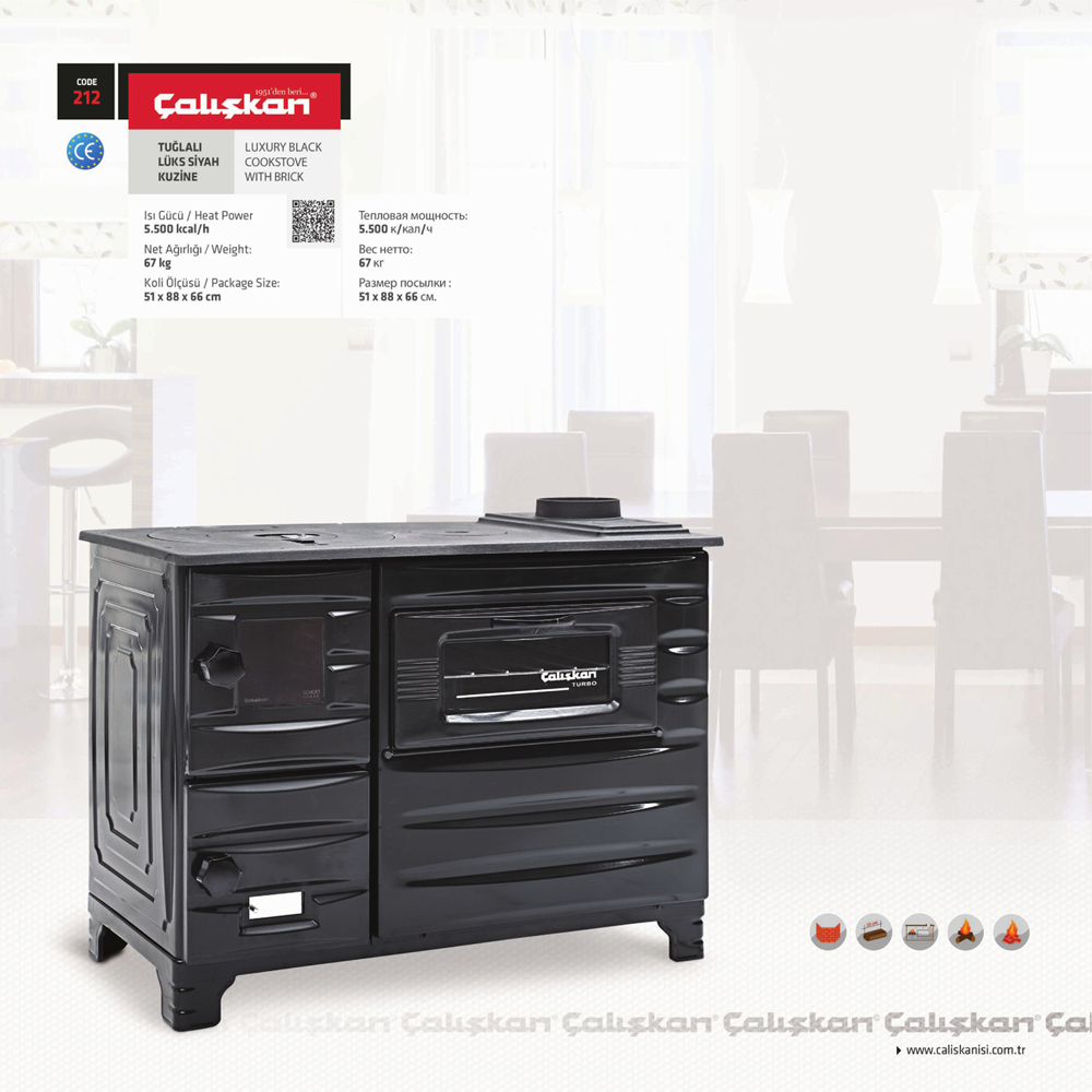 Çalışkan 212 Mat Siyah Tuğlalı Lüks Kuzine, hem ısınma hem pişirme konforunu bir arada sunan modern ve zarif bir soba-kuzine modelidir. 6.330 kW ısı gücüyle 63 m²’ye kadar alanı etkili biçimde ısıtırken, tuğlalı iç yapısı sayesinde ısıyı uzun süre muhafaza eder.